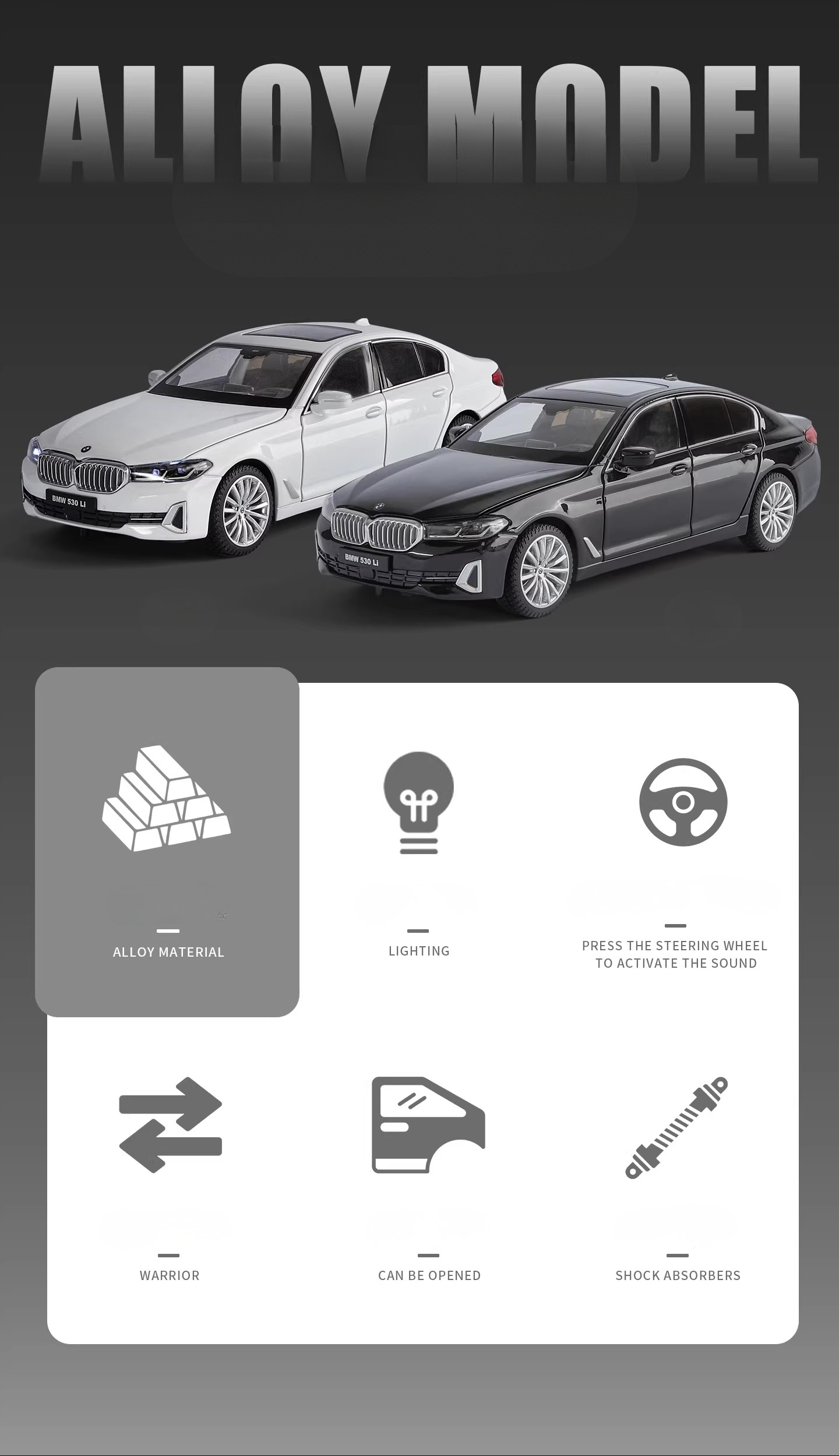 Experience a premium collectible with this BMW 530Li 1:24 Alloy Model Car, designed for both display and interactive play. Made from high-quality alloy, plastic, and rubber components, this model features realistic details and functional parts that bring the car to life.